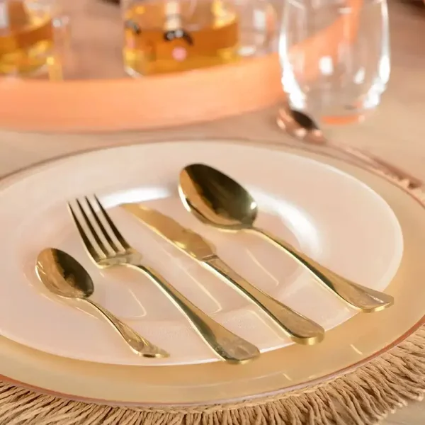 La ménagère 24 pièces or brillant arabesque de Maison H Luxury sublime votre table avec un design raffiné et élégant. Cet ensemble se compose de 6 fourchettes, 6 couteaux, 6 cuillères à soupe et 6 petites cuillères en métal doré brillant, décorées de motifs arabesques sophistiqués qui apportent une touche de luxe intemporel à vos repas.