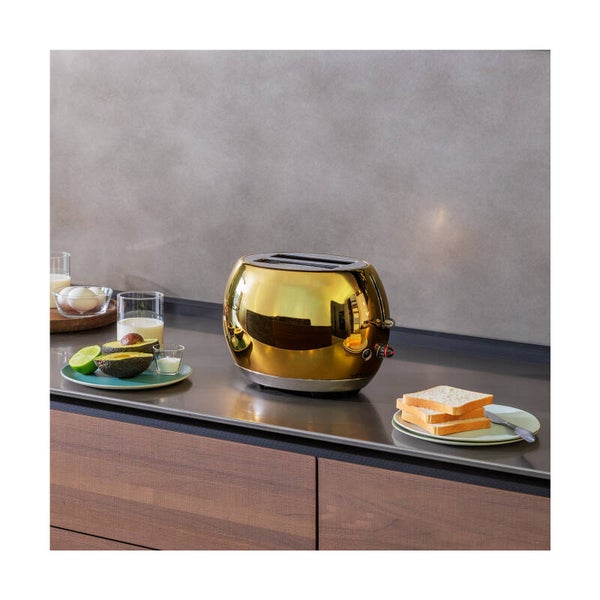 Le grille-pain Don Juan Bugatti couleur or allie élégance et polyvalence avec son design harmonieux signé Andreas Seegatz. Ses grandes fentes accueillent tout type de pain pour griller, décongeler ou réchauffer. Pratique et esthétique, il s’adapte parfaitement aux cuisines modernes et raffinées.